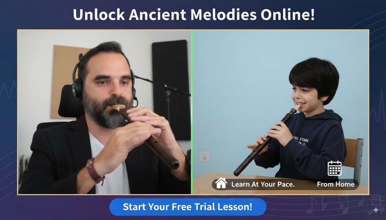 Each one-to-one class is 45 minutes over Zoom. We’ll cover breathing, finger placement, traditional melodies, and gradually move to improvisation or pieces you’re interested in.